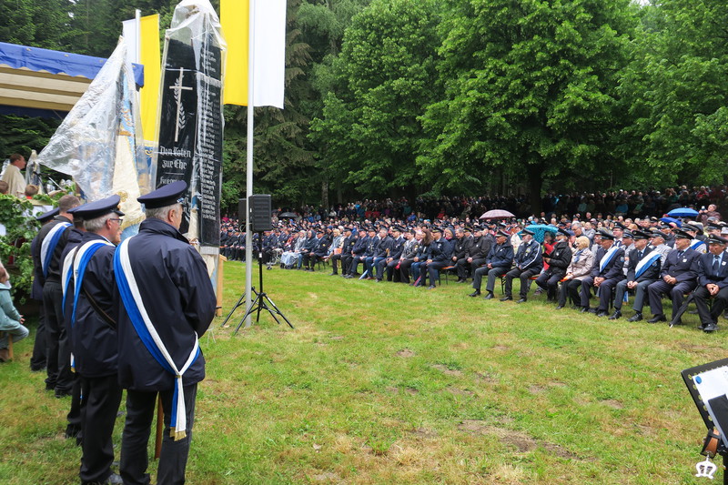 35 Vereine kamen aus mehreren Richtungen nach teilweise weitem Fußmarsch zur Scheppacher Kapelle mit ihren Fahnen und Standarten.